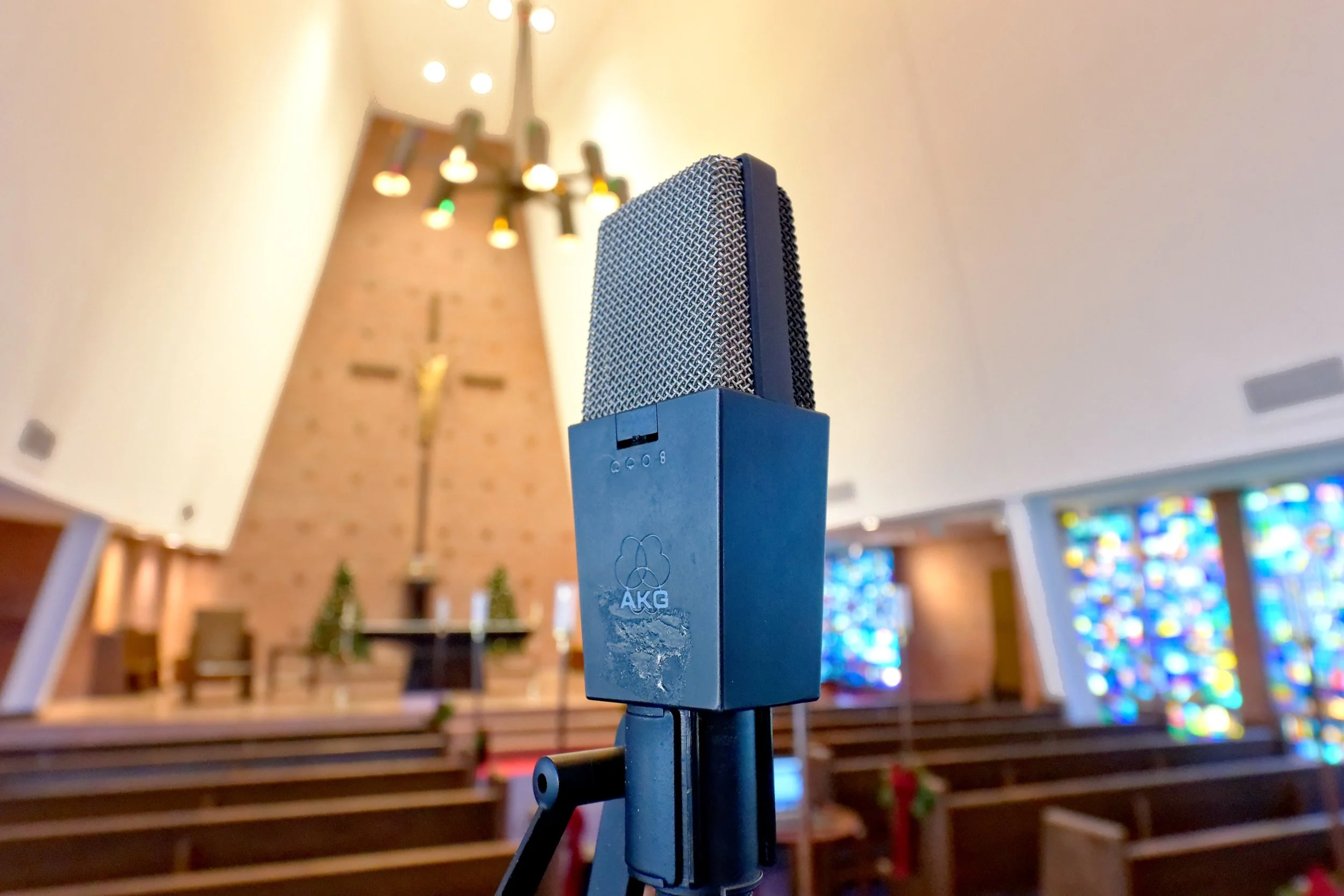 Brought my mini-rig back into Connelly Chapel to capture the amazing acoustic space for the instrument’s convolution reverb, using my venerable AKG C414 BULS condensers. The idea is to record a tone, sweeping from low pitch to high pitch and record the resulting reverberation. Using deconvolver software, I can then create an impulse file to be dropped into UVI Falcon’s impulse reverb so you’ll be able to recreate the chapel’s resonant space when using the sample set.